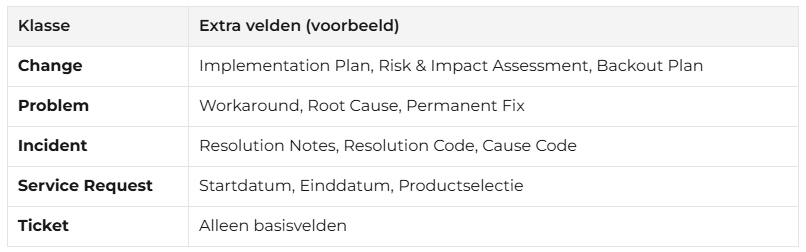 Deze klassen zorgen voor een gestandaardiseerde opbouw van tickets. Op basis van de gekozen klasse worden automatisch specifieke velden getoond of verborgen. Zo blijft het ticketformulier overzichtelijk, en afgestemd op het proces waarvoor het bedoeld is.
