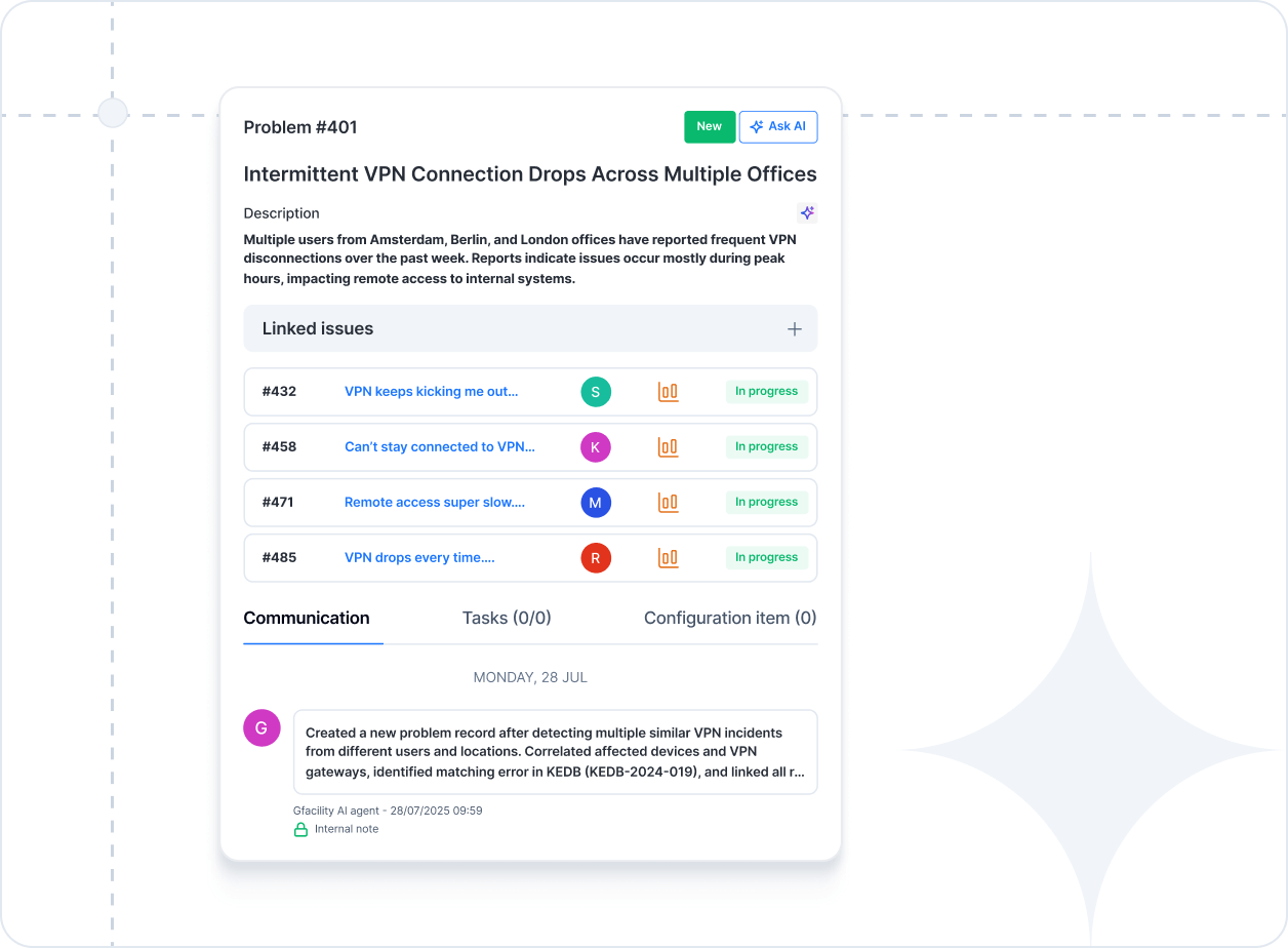 Deliver faster root cause analysis, prevent recurring incidents, and keep your IT environment stable - with AI-driven ITIL 4 best practice problem management from Gfacility.