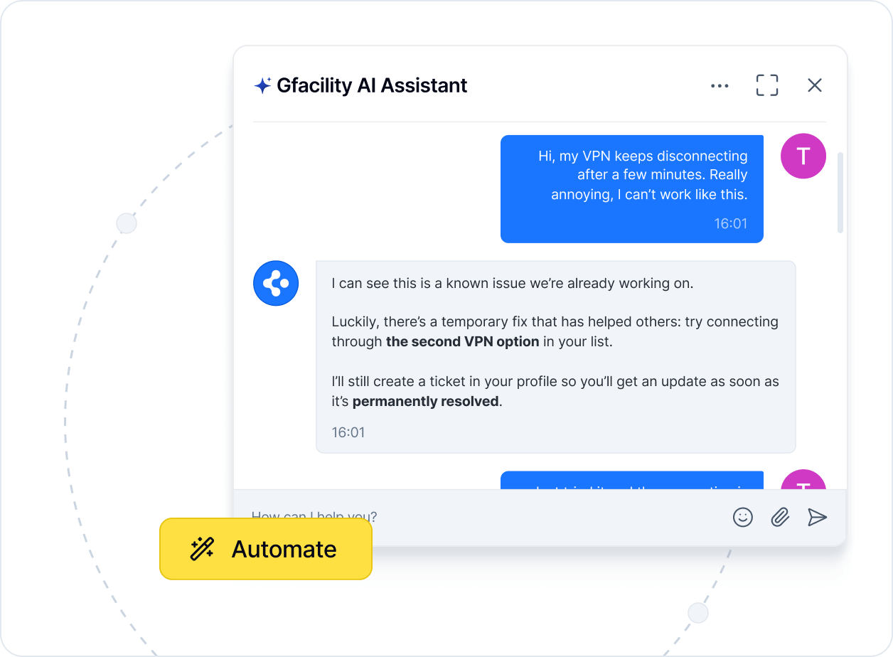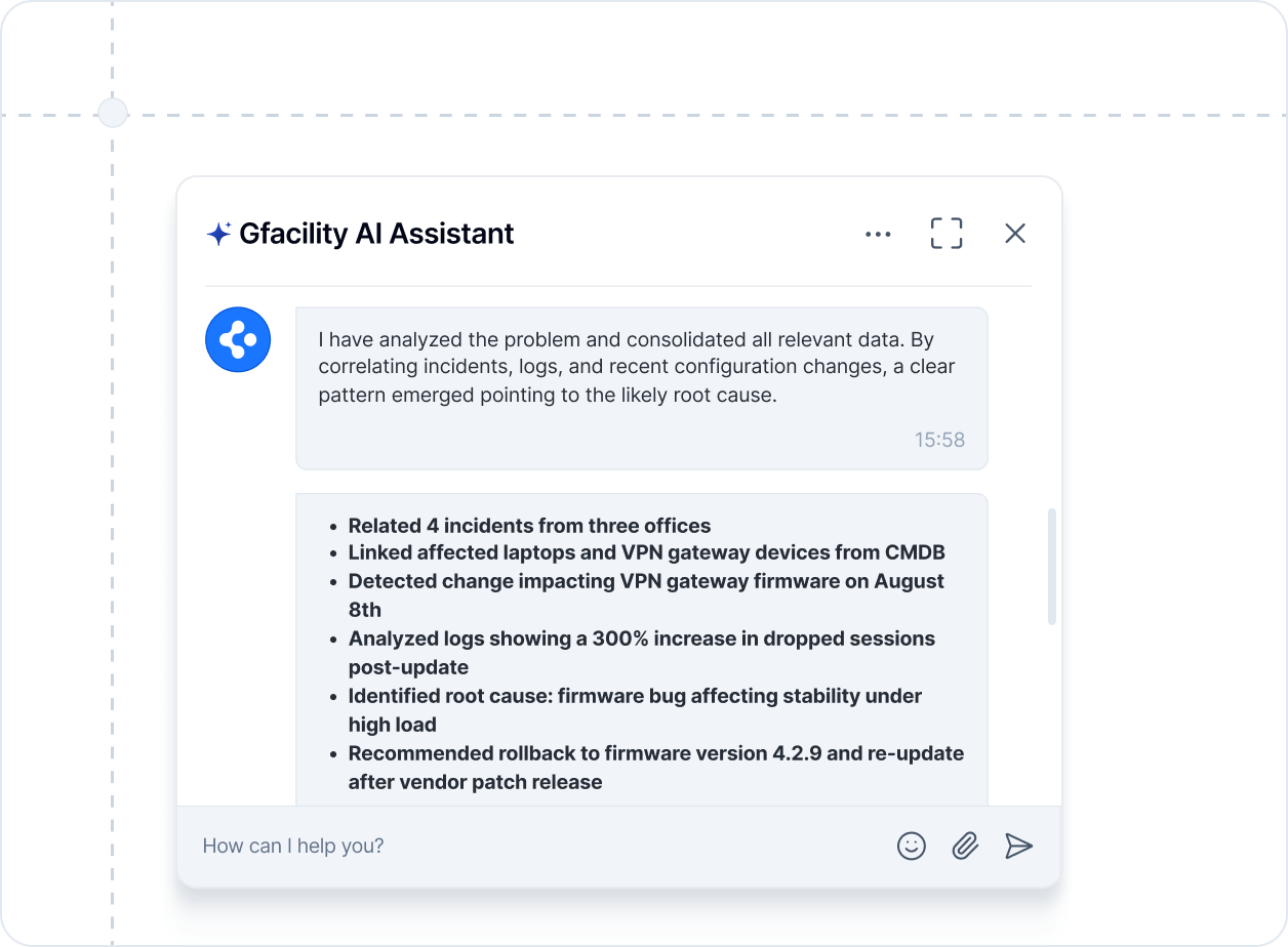 Most IT teams spend too much time reacting to the same issues over and over. Gfacility shifts your focus from quick fixes to long-term stability by combining the structured approach of ITIL 4 best practices with the speed and intelligence of AI automation.