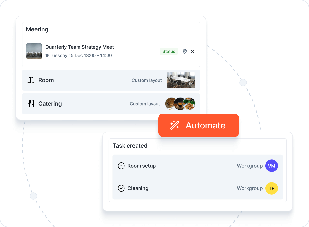Save time and avoid mistakes with automated processes, such as turnaround times between meetings or directing cleaning. Everyone knows exactly what to do and when, so rooms are always perfectly prepared.